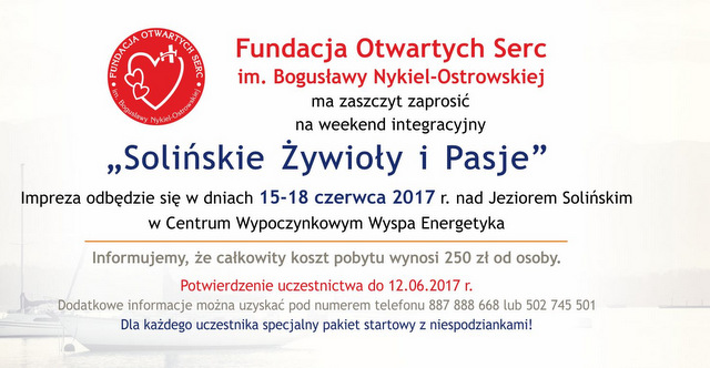 Fundacja Otwartych Serc im. Bogusławy Nykiel-Ostrowskiej ma zaszczyt zaprosić na weekend integracyjny "Solińskie Żywioły i Pasje".